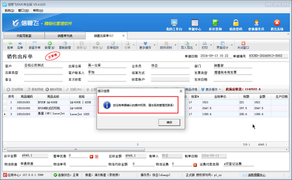 信管飛RMS支持單據確認功能,已審核未確認的單據可以繼續反審修改,已審核已確認的單據無法再反審修改,有用戶操作員賬號在使用軟件時,無法確認已審核的單據,如下圖所示。
