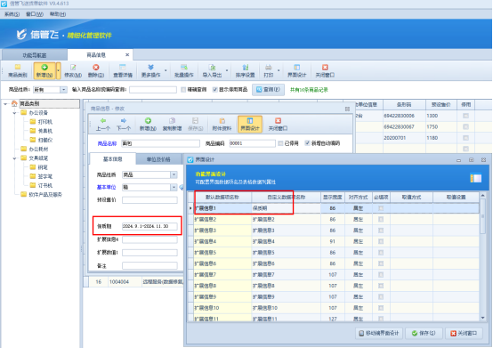 首先需提前在商品信息中添加保質期信息,軟件商品新增界面默認沒有此項,可在擴展信息中錄入,擴展信息可自定義列名為“保質期”,如下圖所示: