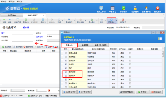 在功能導(dǎo)航窗點(diǎn)擊“銷售管理”,打開銷售出庫(kù)單界面,單據(jù)主體可輸入本次收款金額和收款賬戶,如果單據(jù)主體沒有這兩項(xiàng),可在工具欄點(diǎn)擊“界面設(shè)計(jì)”勾選顯示出這兩項(xiàng),如下圖所示: