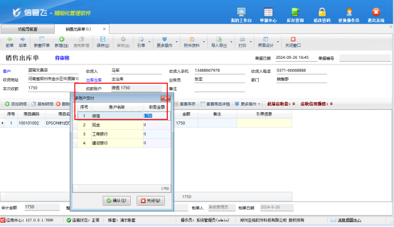 選擇客戶和商品開單,直接收款可直接輸入到本次收款中,收款賬戶默認(rèn)取資金賬戶的默認(rèn)賬戶。如有多個(gè)收款賬戶時(shí),把應(yīng)收金額輸入到收款賬戶中,本次收款金額會(huì)自動(dòng)顯示,如下圖所示: