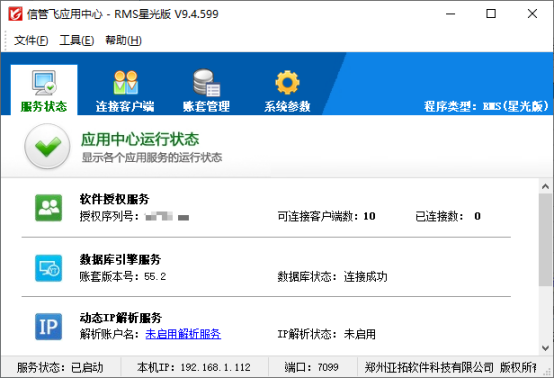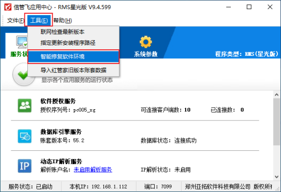 智能修復軟件環(huán)境完成后,請重啟應用中心程序,然后查看下數(shù)據(jù)庫連接狀態(tài)是否顯示為連接成功(如下圖所示),數(shù)據(jù)庫狀態(tài)為連接成功,則軟件即可正常登錄。