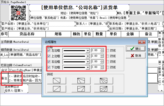 開單界面點“打印”—》“打印格式設計”,選中需要修改的模板,點擊“設計格式”,進入模板設計器界面,依次選中備注文本框,左上方屬性欄可以設置邊框樣式以及邊框線粗細,鼠標右鍵選擇“邊框”,進入邊框屬性窗口,也可對邊框線進行設置。如圖: