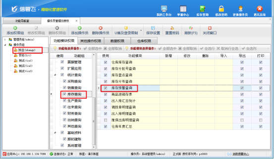 首先使用系統(tǒng)管理員賬號登錄軟件,在功能導航窗點擊“系統(tǒng)管理”—》“操作員及授權”打開操作員管理及授權界面,選擇操作員“張亞”,在其右側的功能模塊權限內選擇“庫存查詢”,將庫存預警查詢勾選,然后保存權限設置,如下圖所示: