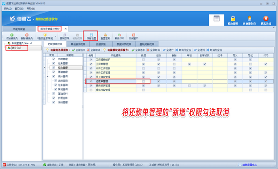 首先使用系統(tǒng)管理員賬號登錄軟件,在功能導航窗點擊“系統(tǒng)管理”—》“操作員及授權”打開操作員管理及授權界面,選擇操作員賬號“張亞”,在右側的功能模塊權限內,選擇綜合管理模塊,將還款單管理的“新增”權限勾選取消,然后保存權限設置,如下圖所示。