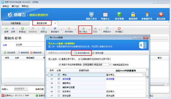 客戶端程序選擇新賬套登錄軟件,新賬套為“未啟用”狀態(tài),功能導(dǎo)航窗點擊“基礎(chǔ)資料”—“期初建賬”,打開“期初庫存錄入”界面。選擇倉庫界面新增“倉庫”并選擇后,點擊工具欄“導(dǎo)入導(dǎo)出”按鈕下的“從Excel導(dǎo)入明細”,通過復(fù)制導(dǎo)出的Excel文件內(nèi)容,粘貼進行導(dǎo)入數(shù)據(jù),下一步對應(yīng)下數(shù)據(jù)項。如下圖所示:
