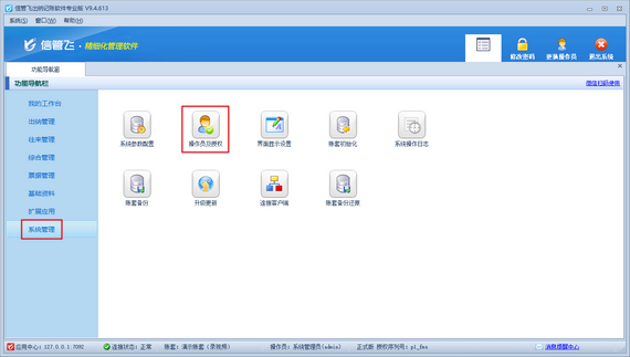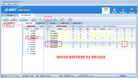 系統(tǒng)管理員登錄軟件,在功能導航窗點擊“系統(tǒng)管理”—》“操作員及授權”,進入“操作員管理及授權”界面,選擇操作員“張亞”,在其右側的功能模塊權限內選擇“票據(jù)管理”模塊,將進/銷項發(fā)票管理的“導出”權限勾選取消,然后保存權限設置,如下圖所示。