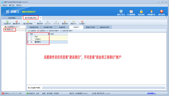 系統管理員可為每位操作員細致分配權限。例如,為操作員“張亞”設置權限時,可明確排除其查看“現金和工商銀行”賬戶的權限,確保信息的隔離與安全。