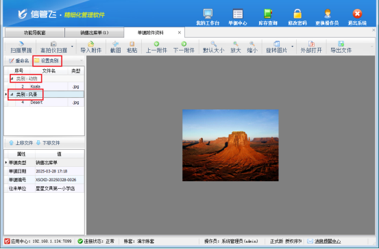 設(shè)置完成后,進入銷售管理模塊新開銷售出庫單并保存后,點擊工具欄上的“附件資料”按鈕,即可進入附件管理界面。此時,附件資料窗口上已經(jīng)新增了“設(shè)置類別”按鈕。點擊該按鈕,可以輕松地設(shè)置常用附件資料的類別,讓附件管理更加有序。