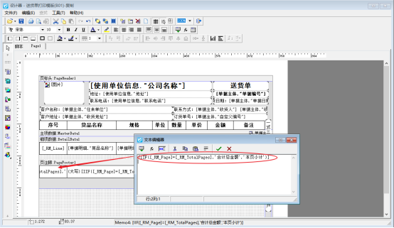 在業務單據界面點擊打印----打印格式設計----設計格式,在模板設計器界面,頁注腳里邊放入文本框,文本顯示:如當前頁等于總頁數,則顯示“總計”,否則顯示“小計”代碼如下:[IIF([_RM_Page]=[_RM_TotalPages],'合計總金額','本頁小計')];