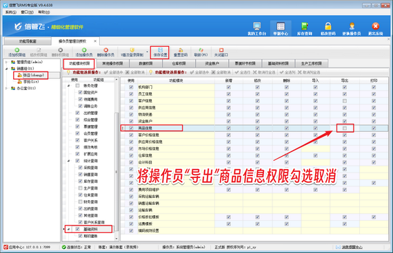 企業(yè)管理人員只需登錄信管飛軟件,在系統(tǒng)設(shè)置中輕松找到操作員及授權(quán)功能。在這里,能夠針對(duì)每個(gè)操作員進(jìn)行個(gè)性化權(quán)限配置。當(dāng)需要禁止某位操作員導(dǎo)出商品信息時(shí),只需簡(jiǎn)單幾步操作,將該操作員商品信息的“導(dǎo)出”權(quán)限勾選取消即可。