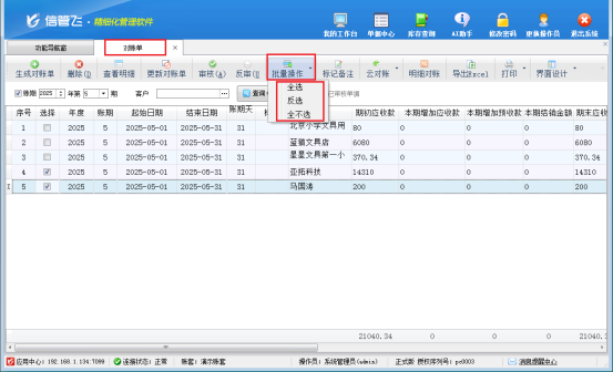靈活選擇對賬單:批量操作功能十分強大,支持全選、全不選、反選等多種選擇方式。無論您是想刪除所有對賬單,還是只刪除部分特定對賬單,都能輕松實現(xiàn)。只需根據(jù)實際需求進行選擇,即可快速鎖定目標。