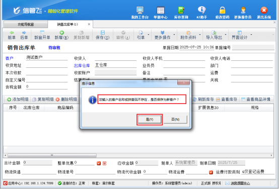配置保存后,重新打開銷售出庫單,此時開單界面即可正常添加新客戶。