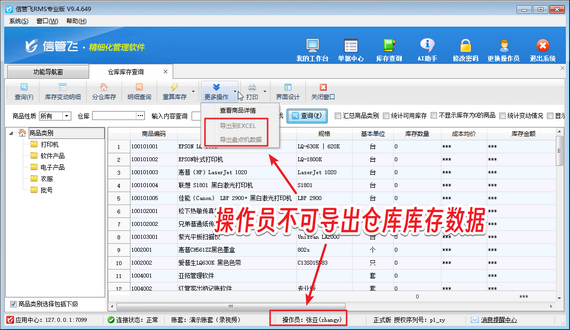 信管飛RMS支持倉庫庫存查詢功能,倉庫庫存查詢可以查看存貨的實(shí)時(shí)庫存情況,包括庫存數(shù)量、庫存成本情況等,同時(shí)支持導(dǎo)出倉庫庫存數(shù)據(jù)。若操作員賬號(hào)登錄軟件無法導(dǎo)出倉庫庫存數(shù)據(jù),通常源于操作員權(quán)限未啟用,本篇文章為您呈現(xiàn)高效解決方案。