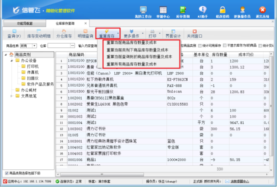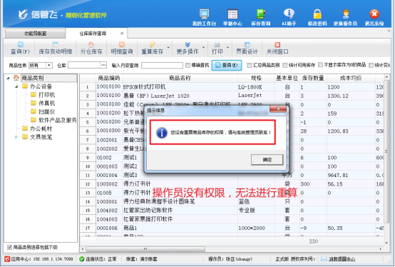 權限設置完成后,切換操作員重新登錄軟件。重新進入倉庫庫存查詢界面,此時就可以正常進行商品庫存重算操作。