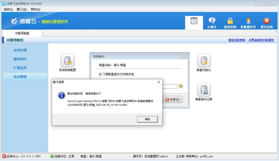 信管飛倉庫管理軟件、信管飛出納記賬軟件、信管飛送貨單軟件、信管飛RMS等本地版軟件賬套數(shù)據(jù)默認存儲在軟件安裝目錄下,支持對賬套數(shù)據(jù)進行備份,如需要更換主機電腦,需要在原來的主機電腦上備份賬套數(shù)據(jù),將生成的備份文件復(fù)制到新的主機電腦上,然后在新的主機電腦上安裝軟件,使用備份文件還原數(shù)據(jù)即可。用戶在備份賬套時遇到備份失敗的情況,該如何處理?