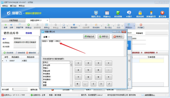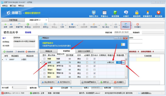 參數設置完成后,在功能導航欄點擊“銷售管理”,新開一張銷售單。打開界面設計,將目光聚焦在“單據明細”的金額上。在這里,您可以根據實際需求,靈活設置金額的取值方式。選擇“計算公式”,并將取值設置為“{規格}*{數量}*{單價}”,最后保存計算公式和界面設計。這一系列操作,如同為軟件注入智慧的靈魂,讓它能夠按照您的要求精準計算金額。詳細操作步驟如下方圖示: