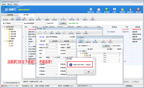 有用戶在使用信管飛 RMS過程中,遇到這樣的問題:修改客戶信息選擇部門時(shí),系統(tǒng)提示 “當(dāng)前部門存在下級部門,不能選擇”,導(dǎo)致操作無法繼續(xù)。這一提示并非故障,而是系統(tǒng)參數(shù)控制帶來的使用限制。